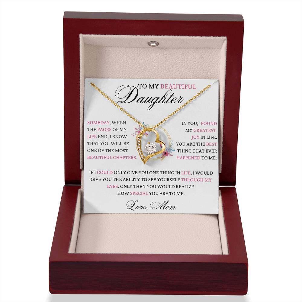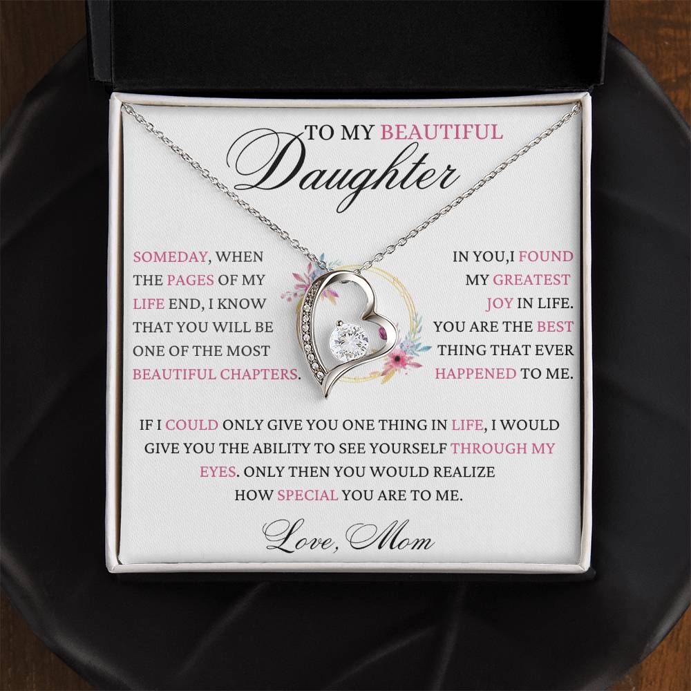 "To My Beautiful Daughter: Someday, when the pages of my life end, I know that you will be one of the most beautiful chapters. in you, I found my greatest joy in life. You are the best thing that ever happened to me. If I could only give you one thing in life, I would give you the ability to see yourself through my eyes. Only then you would realize how special you are to me. I Love You Forever And Always."